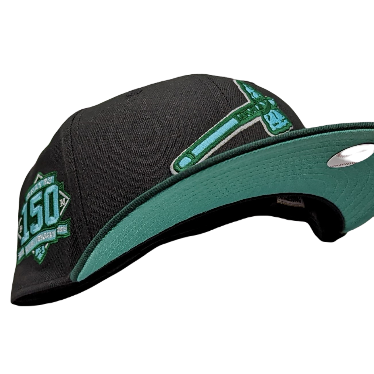 On the side, you'll find the 2021 Atlanta Braves anniversary logo, created to celebrate the 150th anniversary of the founding of the franchise. The logo features a dark green and white diamond with a mint green ribbon below. The cap logos used by the Braves in their three cities are featured with the B from Boston at third base, the M from Milwaukee at first, and the A from Atlanta at home. The number 150 is prominently displayed over the diamond in mint green.