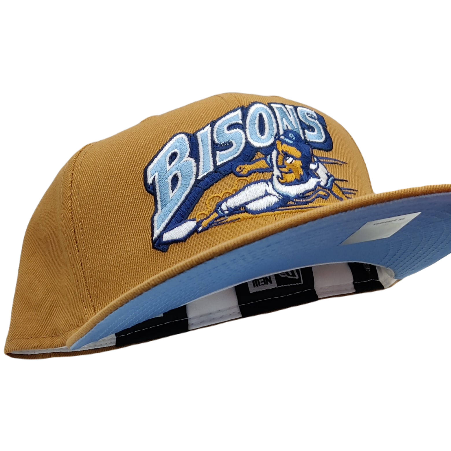 Capture the essence of outdoor love and sports spirit with the New Era 59Fifty Buffalo Bisons Wheat with Icy Blue UV Fitted Hat. Our tribute to the grandeur of the Buffalo Bisons, this timeless piece marries style and comfort with an exquisitely designed wheat crown and brim, reminiscent of the golden glow of a wheat field under the clear blue sky. Here's what to expect: