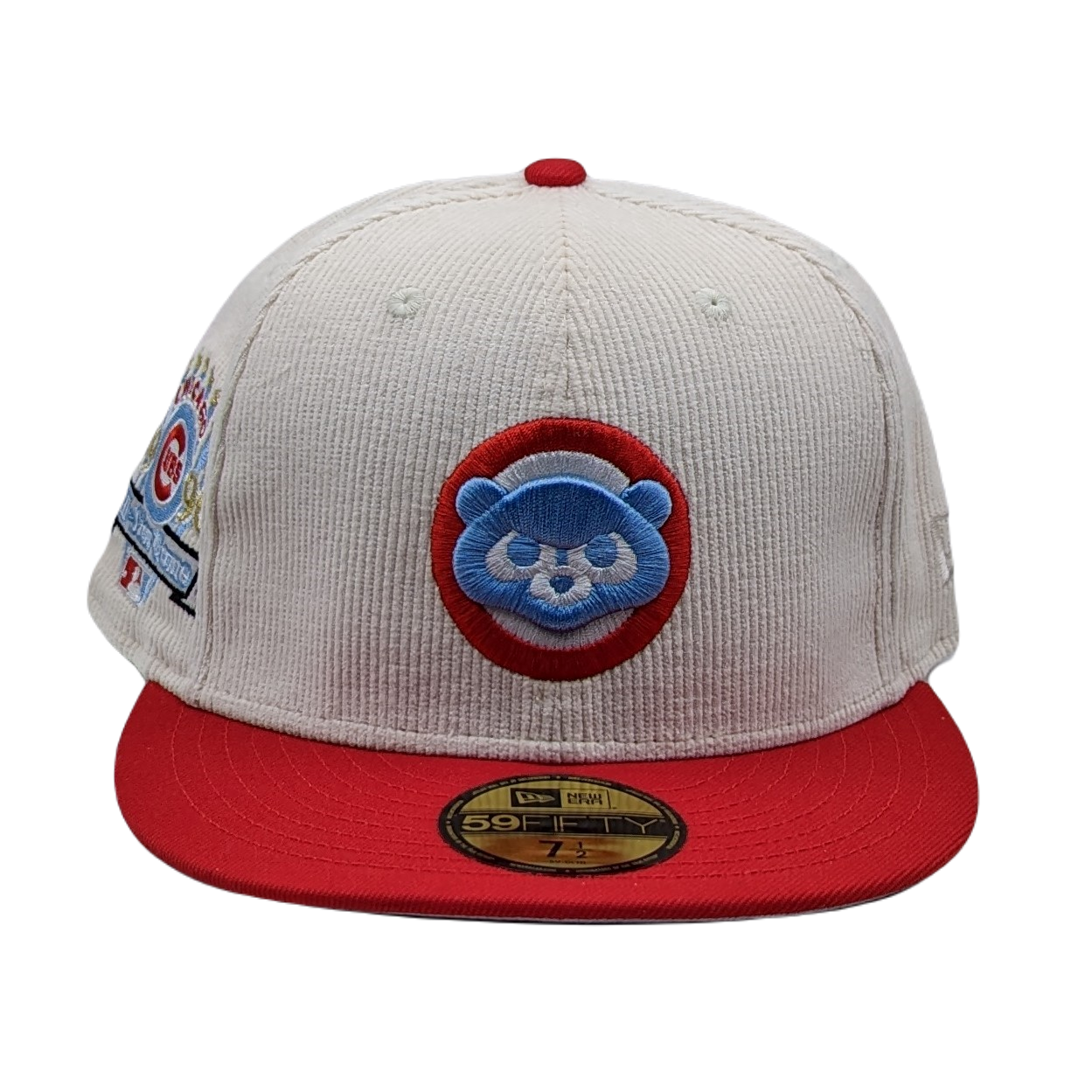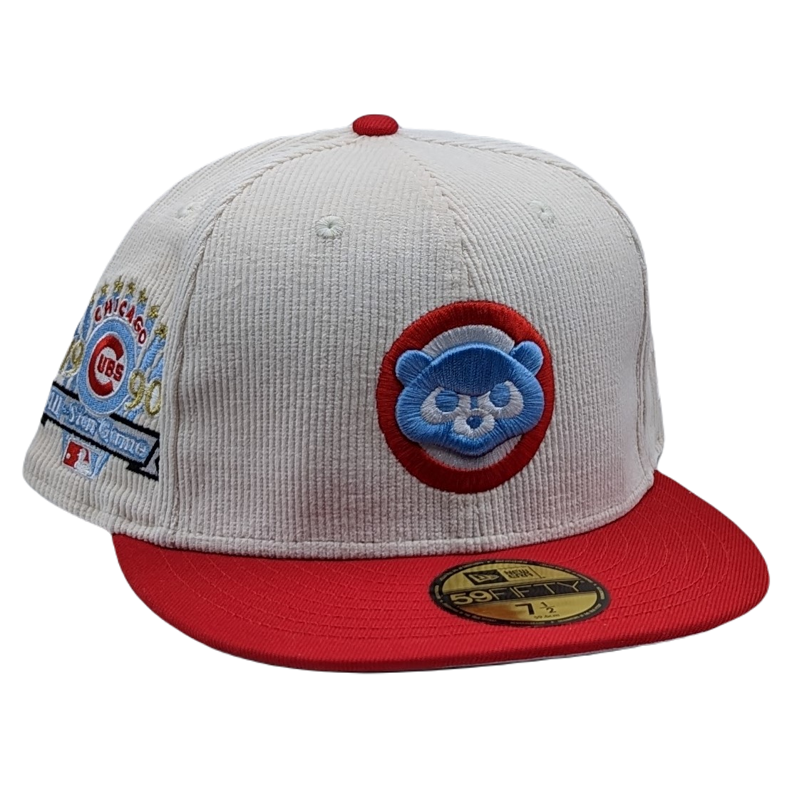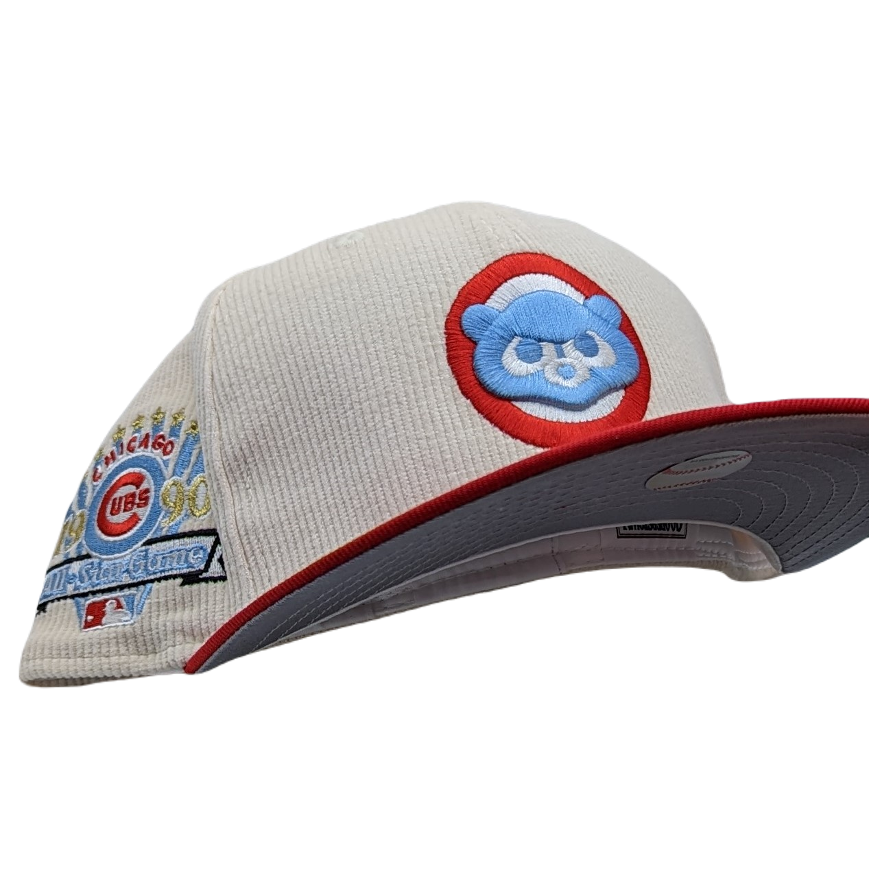 Introducing the New Era 59Fifty Chicago Cubs 1990 All-Star Game Corduroy Fitted Hat, a fashionable nod to the memorable game while showcasing the iconic Cubs logo from 1979-1993. This unique cap features a white corduroy crown, red brim, and a grey under visor, creating a timeless and eye-catching color combination. The front of the hat displays the distinctive metallic sky blue bear set within a metallic red circle, adding a touch of retro charm. A commemorative 1990 All-Star Game side patch completes this standout design.