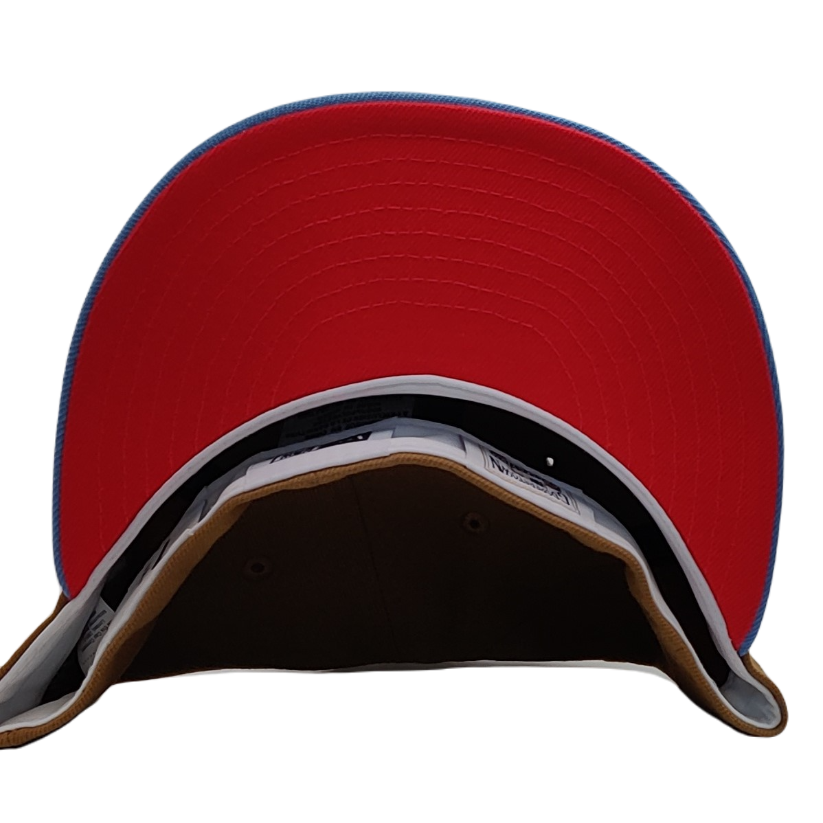 - Sky blue brim and top button, adding a pop of color to the design.