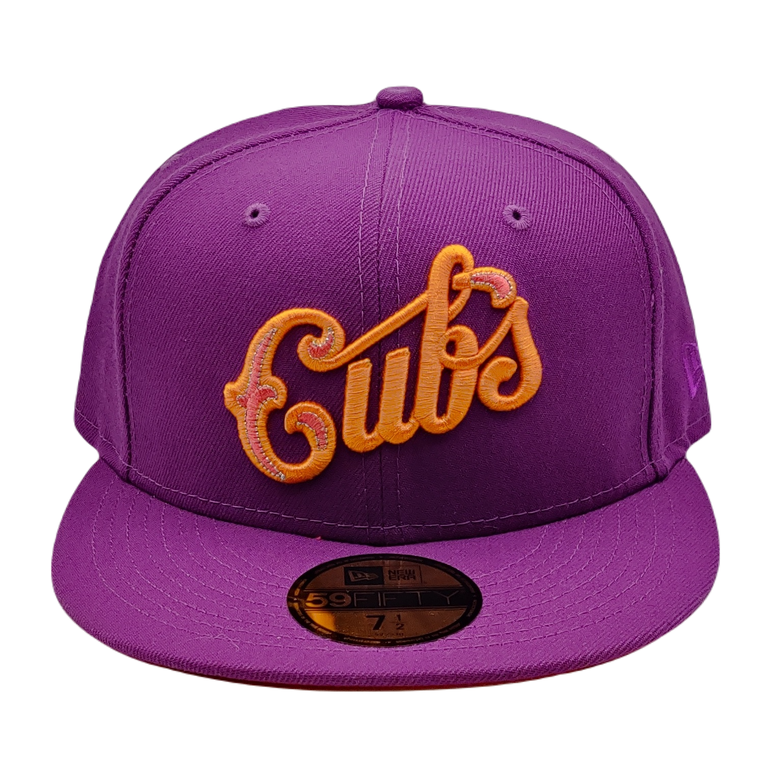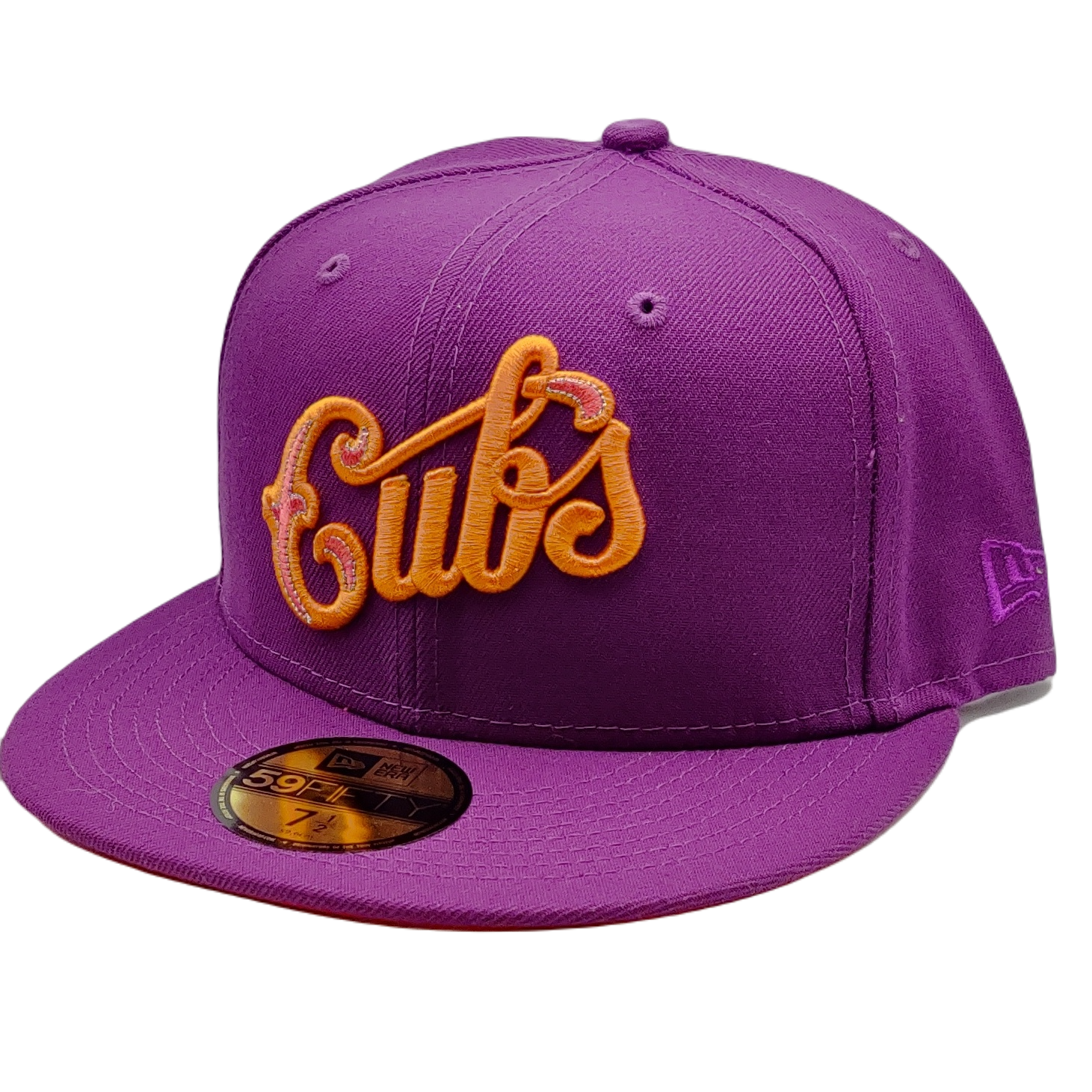 Step out in style, blaze your own trail with our New Era 59Fifty Chicago Cubs Purple Fitted Hat. Carved from the spirit of Chi-Town, the hat captures the city's vibrant life and the glorious history of the Chicago Cubs. Bathed in purple, the hat radiates a royal charm while incorporating subtle elements of lava red and orange, igniting a fiery allure. The hat's features include: