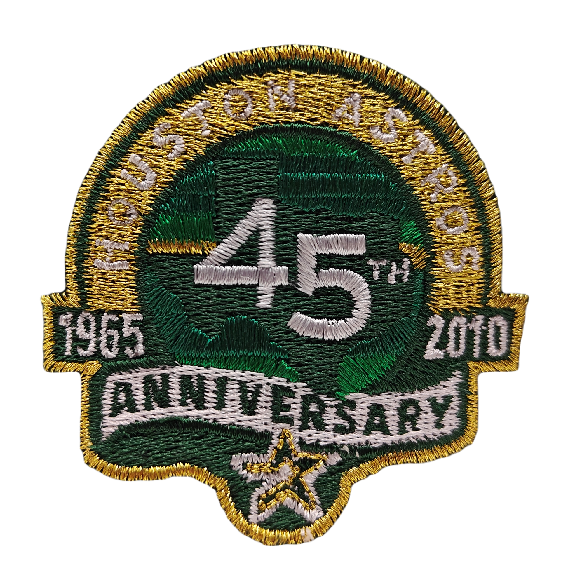- 2010 Anniversary side patch, celebrating the Houston Astros' 45th anniversary from 1965-2010, featuring metallic green and gold stitching for a touch of shimmer and visual appeal.
