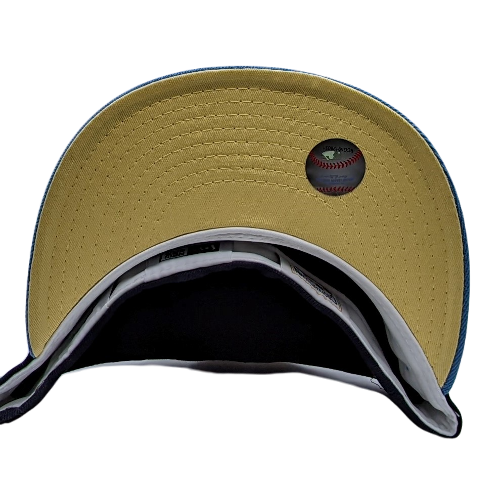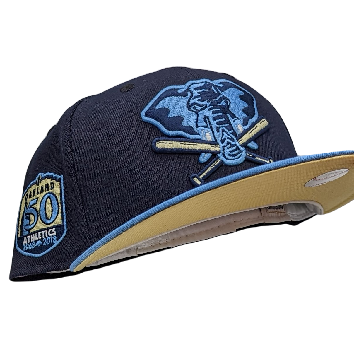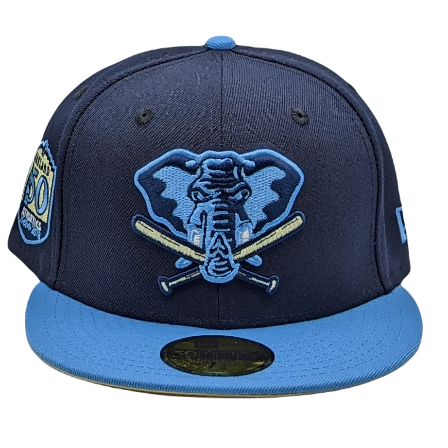 Turn up your style game with an infusion of athletic legacy and contemporary chic. Our New Era 59Fifty Oakland Athletics 50th Anniversary Patch Fitted Hat is the perfect embodiment of sportswear styling and urban sensibilities. Framed against a navy crown, the sky-blue brim, top button, and butter yellow under visor evoke the spirit of the Oakland Athletics. Aesthetically appealing and functionally superior, this fitted hat comes with the following features:
