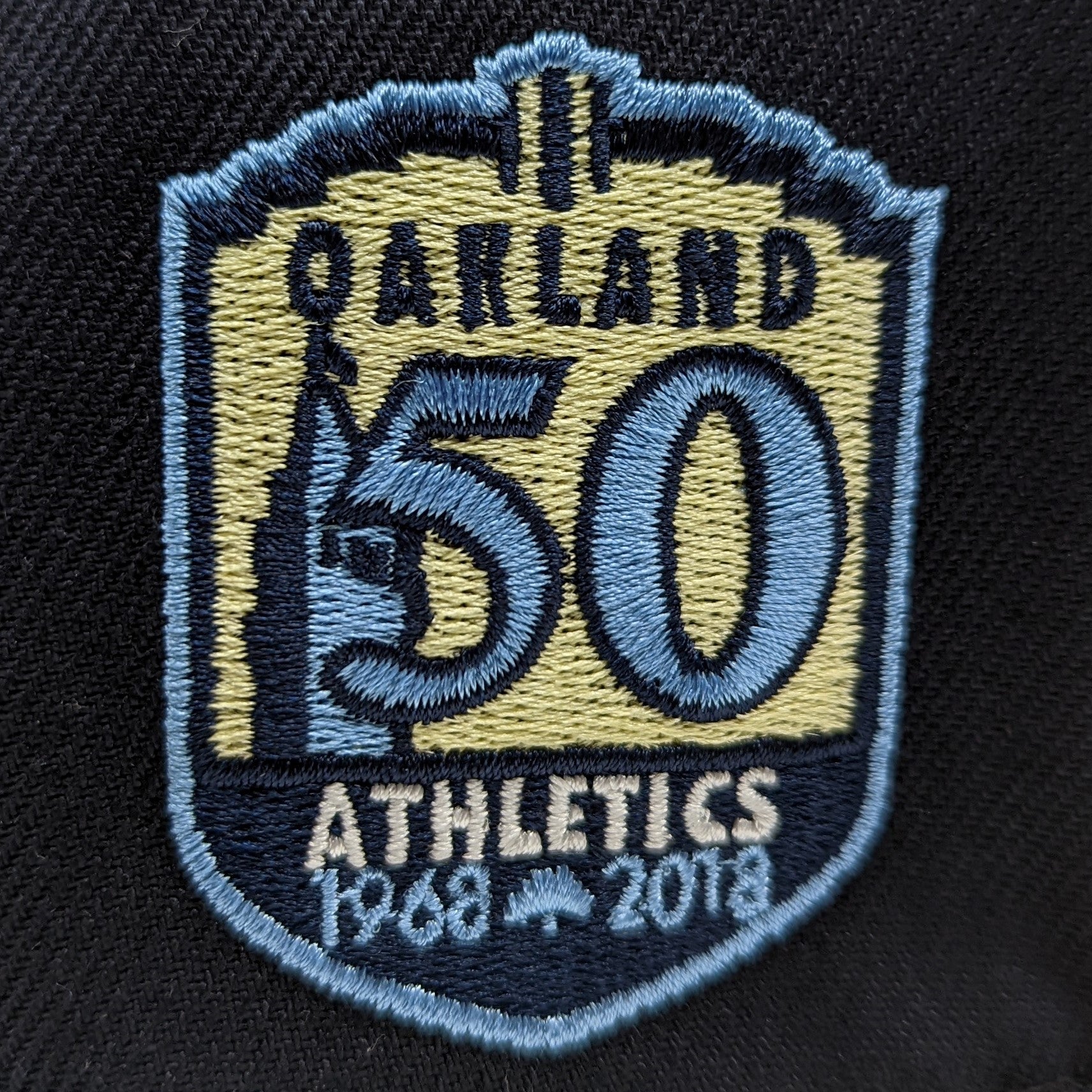 - A fitting tribute to A’s long-standing journey in major league baseball, featuring the 2018 Oakland Athletics 50th-anniversary logo on the side patch.