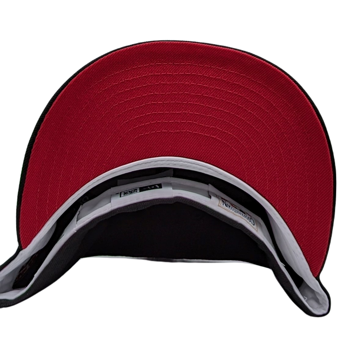 Nike Jordan 1 Retro High Satin Black Toe: Its high contrast black, white and red color perfectly mimics the hat's color palette, making it an excellent choice for a coordinated look.
