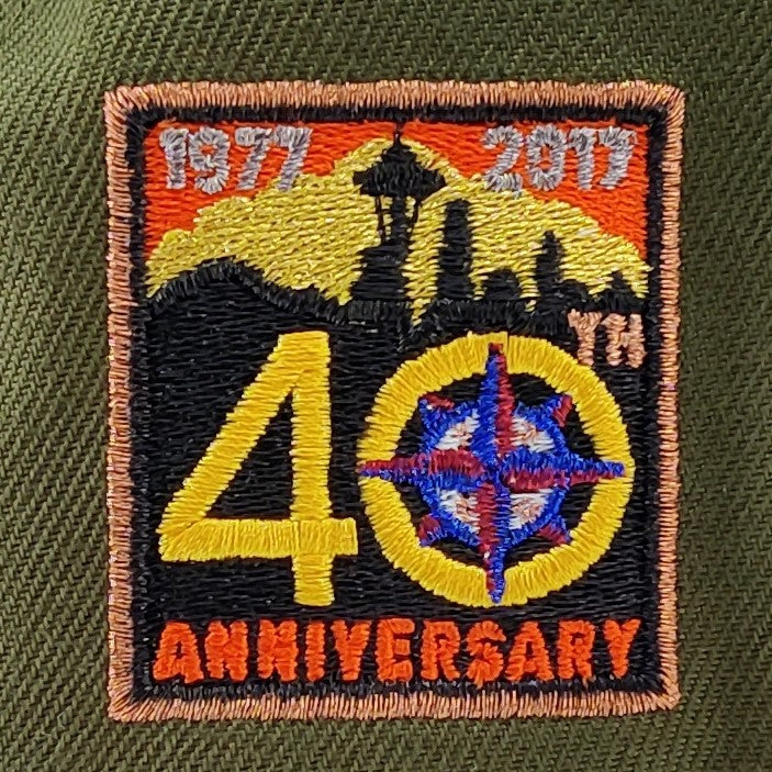 - The side patch featuring the 2017 anniversary logo, a celebration of the 40th anniversary complete with a vibrant yellow and orange backdrop, and the iconic Seattle skyline. Details include a metallic bronze stitched frame for a shimmering finish.