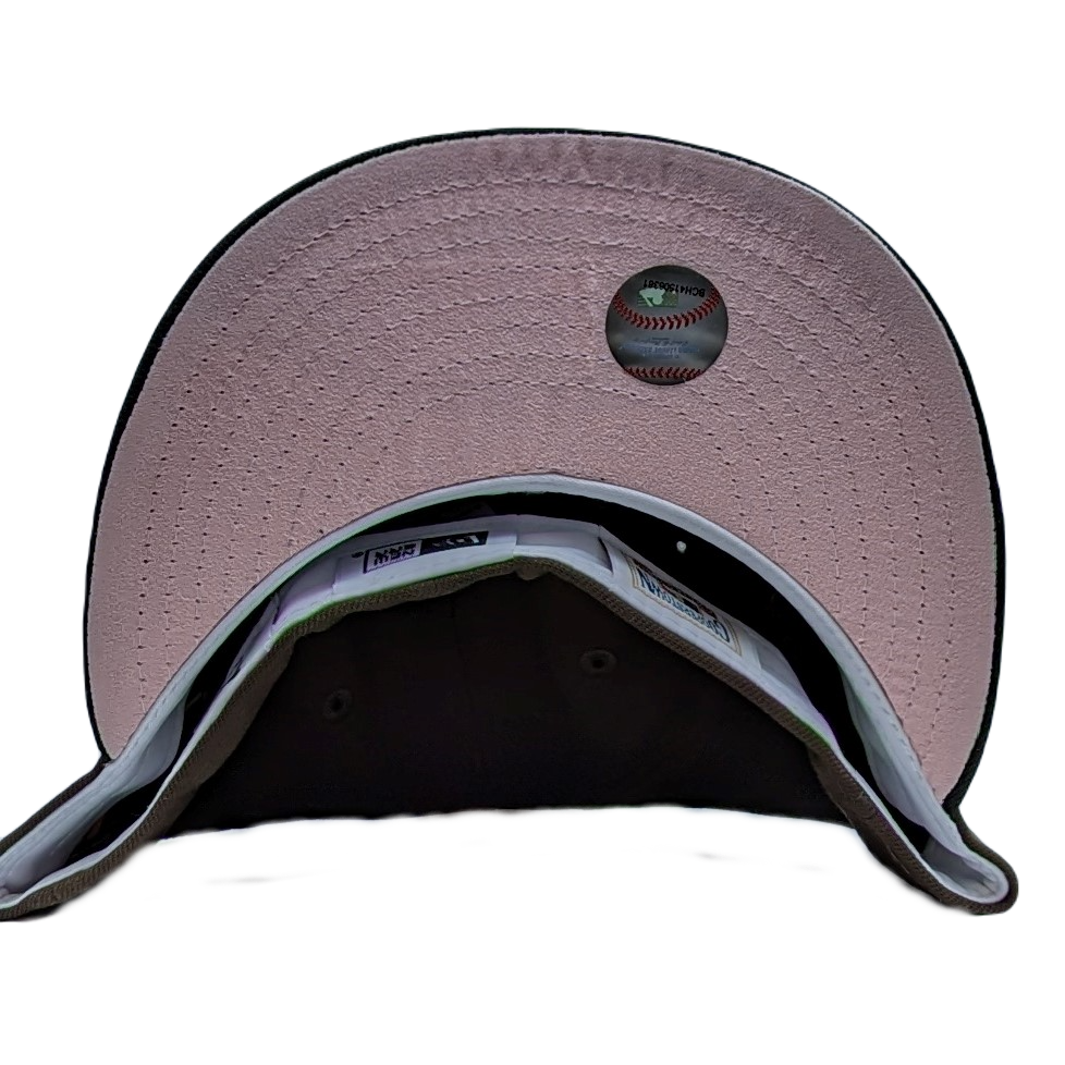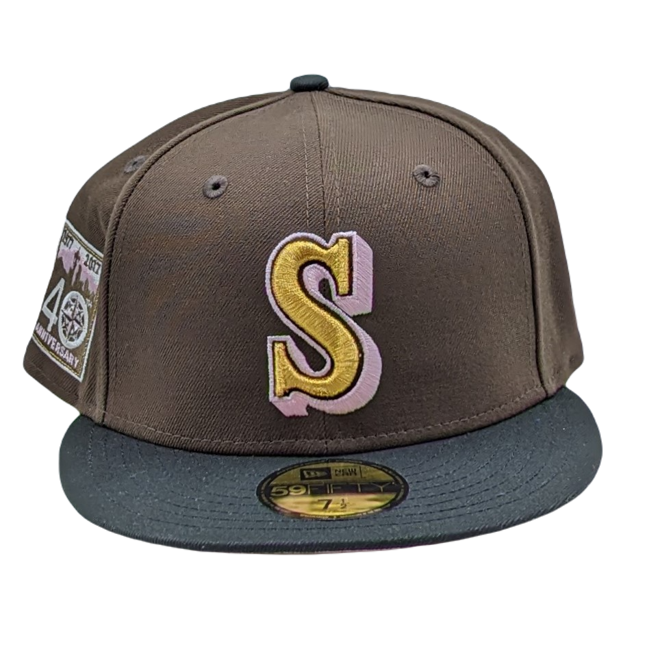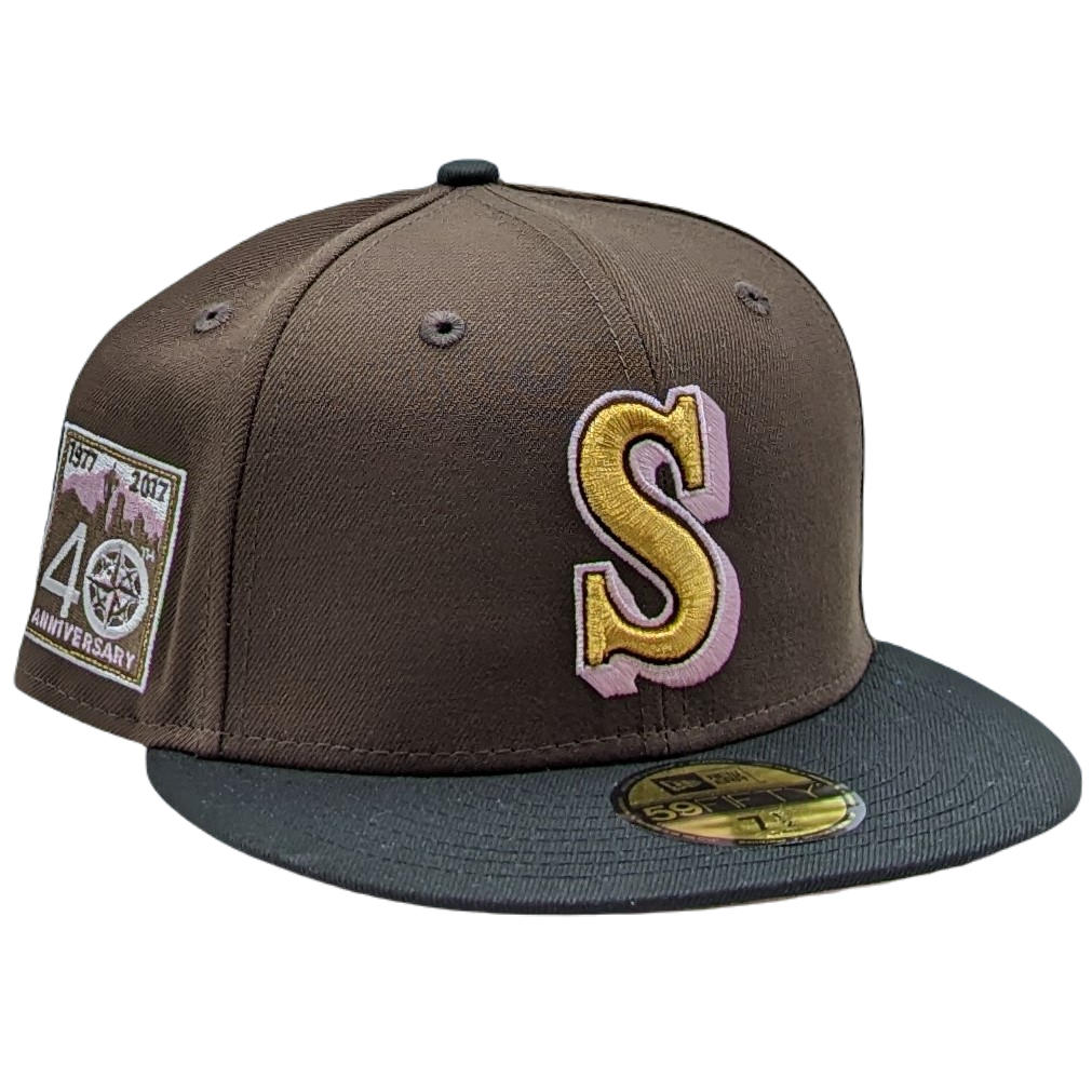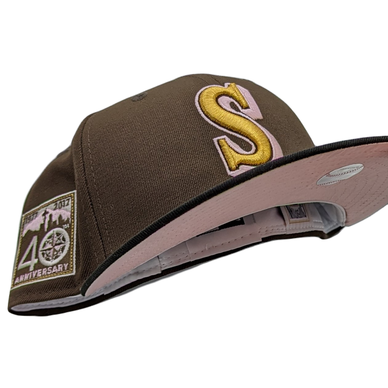 Introducing the New Era 59Fifty Seattle Mariners 40th Anniversary Patch Fitted Hat, a unique and stylish addition to your hat collection. This premium fitted hat features a mocha brown crown, black brim, and a pink under visor, creating a striking color combination that's sure to turn heads. The 1987-1992 "S" logo takes center stage, crafted in metallic gold with pink accents for added flair.