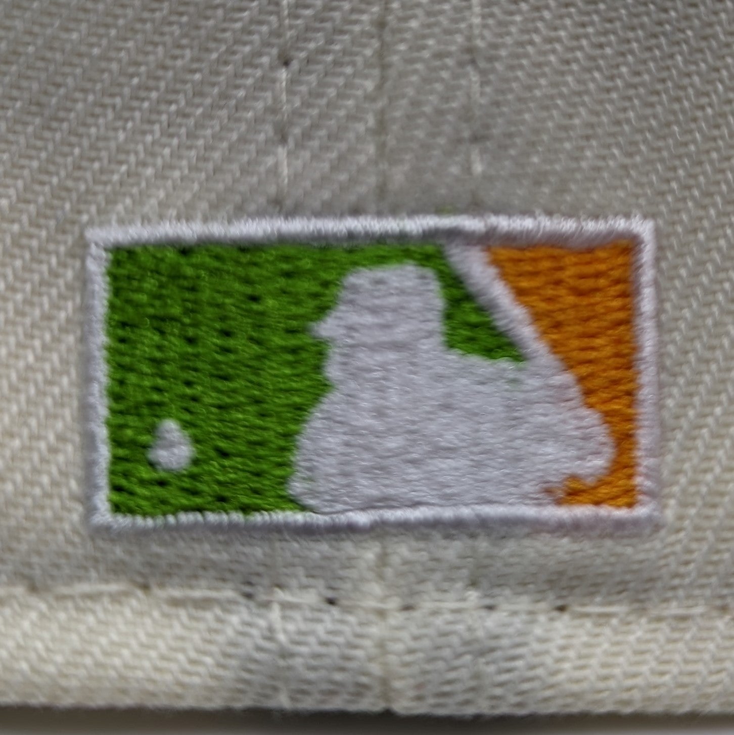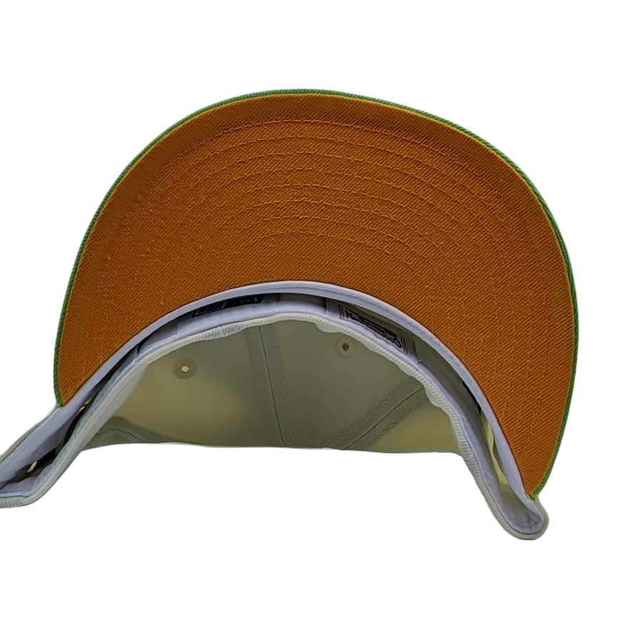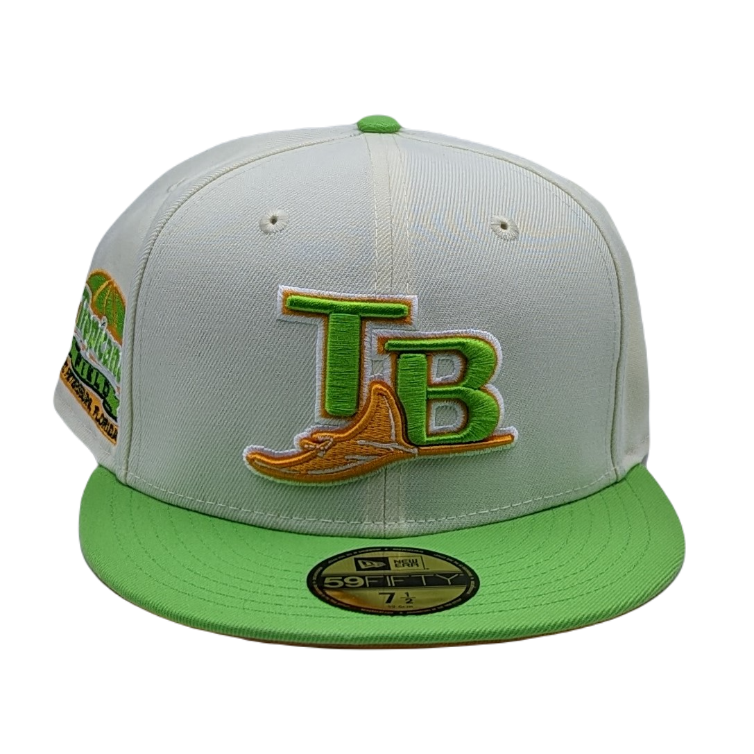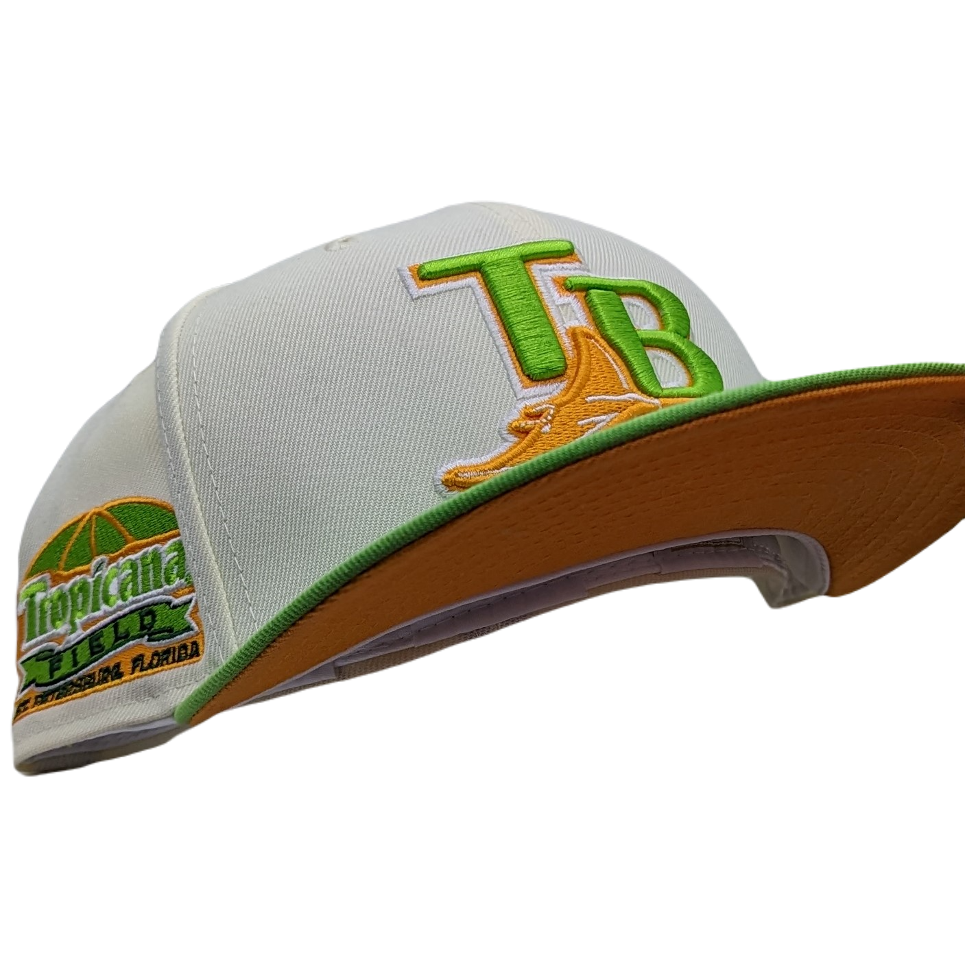 Celebrating the history of the Tampa Bay Devil Rays and the vibrant colors of Tropicana brands, this exclusive New Era 59Fifty fitted hat is a must-have for fans and collectors alike. The striking white crown is contrasted by a bold lime green brim and top button, while the orange undervisor adds a unique twist to the design.