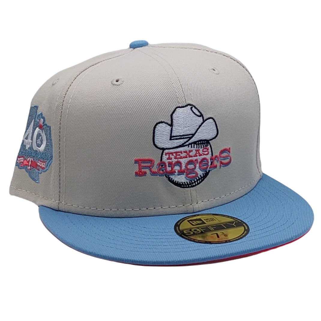 Embrace a slice of baseball history with the New Era 59Fifty Texas Rangers 40th Anniversary Patch Fitted Hat. Radiating the spirit of the Lone Star State, this cap melds a robust design with a celebration of heritage. Showcased in a serene stone crown with a contrasting light blue brim and top button, the hat resonates with the sparkling skies of Texas. Key features include: