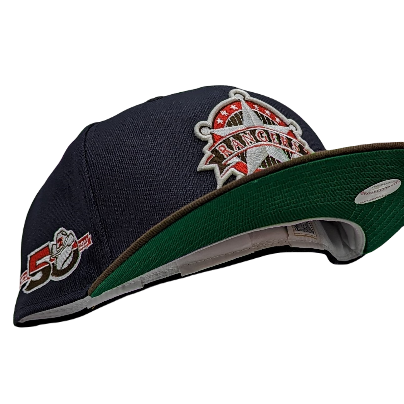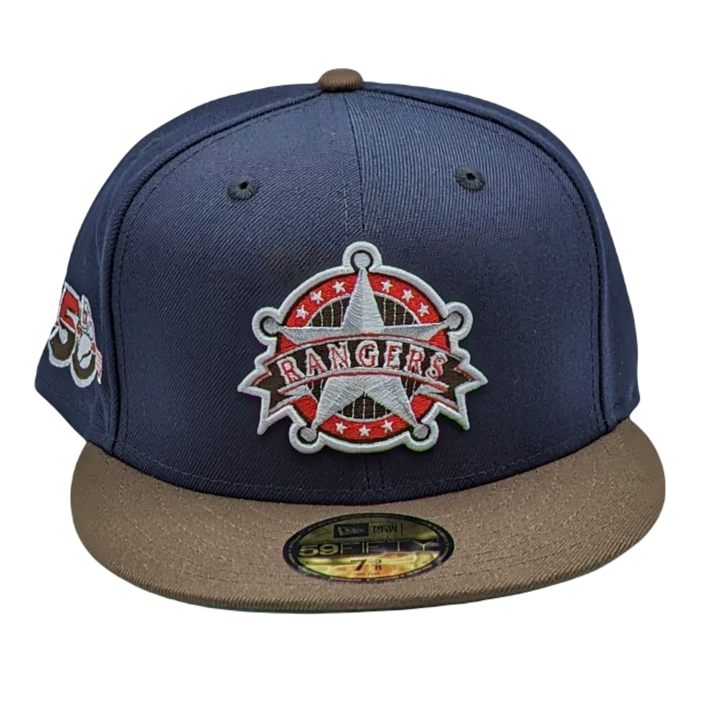 Commemorate a significant milestone in Texas Rangers' history with this exclusive New Era 59Fifty Texas Rangers 50th Anniversary Patch Fitted Hat. Showcasing a striking navy crown and a distinctive brown brim with a kelly green under visor, this unique cap is a must-have addition for any Texas Rangers fan or fitted hat enthusiast.